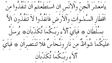 Diyor ki: "Ey acz ve hakareti içinde mağrur ve mütemerrid ve zaaf ve fakrı içinde serkeş ve muannid olan ins ve cin! Emirlerime itaat etmezseniz, haydi, elinizden gelirse hudud-u mülkümden çıkınız! Nasıl cesaret edersiniz ki, öyle bir Sultanın emirlerine karşı gelirsiniz; yıldızlar, aylar, güneşler, emirber neferleri gibi emirlerine itaat ederler. Hem tuğyanınızla öyle bir Hâkim-i Zülcelâle karşı mübareze ediyorsunuz ki, öyle azametli mutî askerleri var, faraza şeytanlarınız dayanabilseler, onları dağ gibi güllelerle recmedebilirler. Hem küfranınızla öyle bir Mâlik-i Zülcelâlin memleketinde isyan ediyorsunuz ki, cünudundan öyleleri var, değil sizin gibi küçük, âciz mahlûklar, belki farz-ı muhal olarak dağ ve arz büyüklüğünde birer adüvv-ü kâfir olsaydınız, arz ve dağ büyüklüğünde yıldızları, ateşli demirleri size atabilirler, sizi dağıtırlar. Hem öyle bir kanunu kırıyorsunuz ki, onunla öyleler bağlıdır, eğer lüzum olsa arzınızı yüzünüze çarpar, gülleler gibi, küreler misilli yıldızları üstünüze Allah'ın izniyle yağdırabilirler."