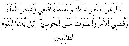 Aynen öyle de, Padişah-ı Bîmisal, kavm-i Nuh'un mahvı için semâvat ve arza emir vermiş. Vazifelerini yaptıktan sonra, ferman ediyor: "Ey arz, suyunu yut. Ey semâ, dur, işin bitti." Su çekildi. Dağın başında memur-u İlâhînin çadır vazifesini gören gemisi kuruldu. Zalimler cezalarını buldular.