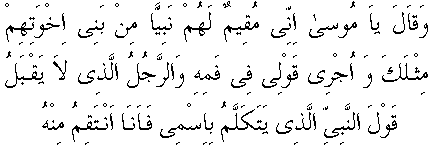 Yani, "Benî İsrail'in kardeşleri olan Benî İsmail'den, senin gibi birini göndereceğim. Ben sözümü onun ağzına koyacağım; Benim vahyimle konuşacak. Onu kabul etmeyene azap vereceğim."6