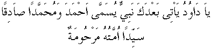Zebur'da, Yetmiş İkinci Bâbında şu âyet var: "Bahirden bahre mâlik ve nehirlerden, arzın makta' ve müntehâsına kadar mâlik ola... Ve kendisine Yemen ve Cezayir mülûkü hediyeler götüreler... Ve padişahlar ona secde ve inkıyad edeler... Ve her vakit ona salât ve hergün kendisine bereketle dua oluna... Ve envârı, Medine'den münevver ola... Ve zikri, ebedü'l-âbâd devam ede... Onun ismi, şemsin vücudundan evvel mevcuttur; onun adı güneş durdukça münteşir ola..."22