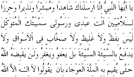 Hem Abâdile-i Seb'adan ve kütüb-ü sabıkada çok tetkikat yapan Abdullah ibni Amr ibni'l-Âs ve meşhur ulema-i Yehuddan en evvel İslâma gelen Abdullah ibni Selâm ve meşhur Kâ'bü'l-Ahbar denilen Benî İsrail'in allâmelerinden, o zamanda daha çok tahrifata uğramayan Tevrat'ta aynen şu gelecek âyeti ilân ederek göstermişler. Âyetin bir parçası şudur ki: Mûsâ ile hitaptan sonra, gelecek Peygambere hitaben şöyle diyor:
