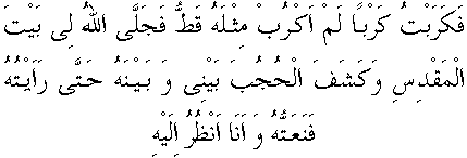 Yani, "Onların tekziplerinden ve suallerinden pek çok sıkıldım. Hattâ öyle bir sıkıntı hiç çekmemiştim. Birden, Cenâb-ı Hak, Beytü'l-Makdisi bana gösterdi. Ben de Beytü'l-Makdise bakıyorum, birer birer herşeyi tarif ediyordum."17 İşte, o vakit Kureyş baktılar ki, Beytü'l-Makdisten doğru ve tam haber veriyor.