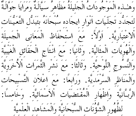 Elhasıl, şu mevcudat-ı seyyâle, şu mahlûkat-ı seyyâre, Vâcibü'l-Vücudun envâr-ı icad ve vücudunu tazelendirmek için müteharrik aynalar ve değişen mazharlardır.